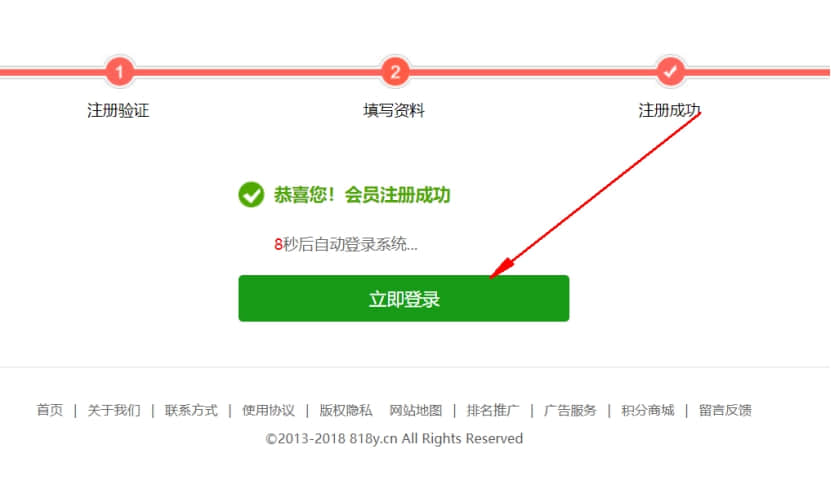 5. 點(diǎn)擊立即注冊(cè)后,提示注冊(cè)成功,10秒內(nèi)會(huì)自動(dòng)登陸會(huì)員中心,也可以點(diǎn)擊立即登陸,進(jìn)入會(huì)員中心.