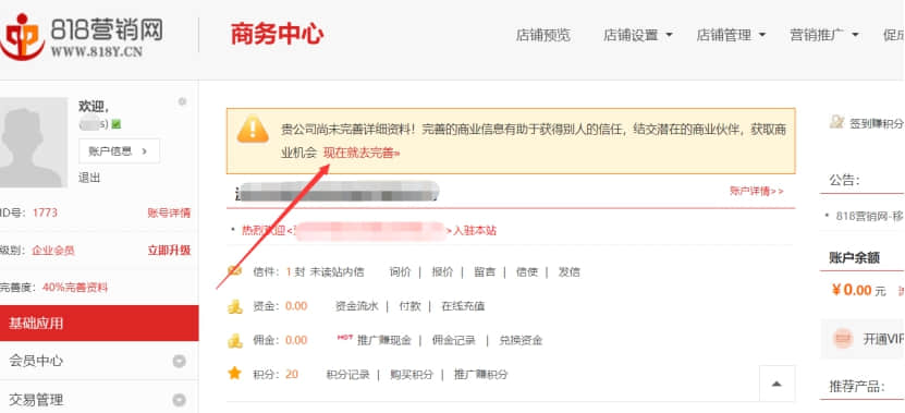 7. 首先,你需要完善公司相關(guān)資料,點(diǎn)擊圖示里面的現(xiàn)在就去完善.