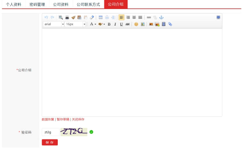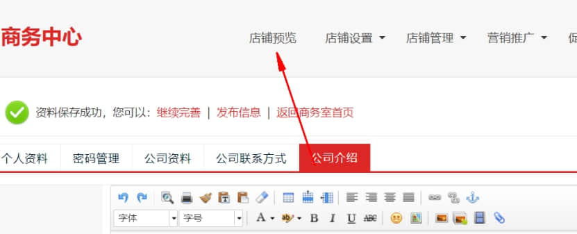 12. 接下來,要填寫公司簡(jiǎn)介,也是會(huì)直接展現(xiàn)在網(wǎng)站上面的企業(yè)介紹里面.點(diǎn)擊保存后,提示資料保存成功.