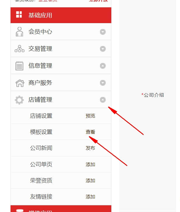 在會(huì)員中心,左側(cè)基礎(chǔ)應(yīng)用,選擇店鋪管理,選擇模板設(shè)置