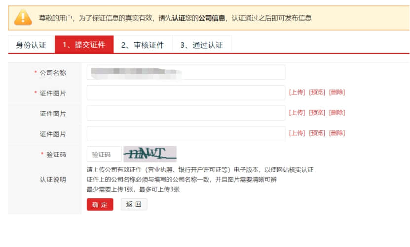 17. 現(xiàn)在我們?nèi)グl(fā)布產(chǎn)品,發(fā)布產(chǎn)品前,必須要上傳公司的資質(zhì)材料,進(jìn)行審核.**欄證件圖片,上傳營(yíng)業(yè)執(zhí)照副本彩色掃描件,第二欄,可以上傳其它資質(zhì)文件.輸入驗(yàn)證碼后,等待平臺(tái)審核.