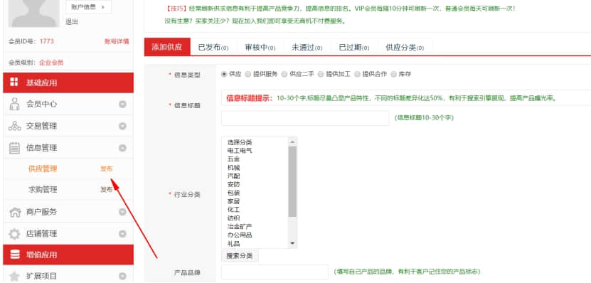 18. 資質(zhì)審核通過后,在左側(cè),信息管理,供應(yīng)管理,選擇發(fā)布.添加供應(yīng)產(chǎn)品.錄入完整的產(chǎn)品信息后,選擇發(fā)布即可.等審核通過后(營(yíng)銷寶會(huì)員免審核),即可展示出來.提示:產(chǎn)品圖片尺寸為橫向長(zhǎng)方形,這樣有利于百度收錄你的產(chǎn)品圖片.發(fā)布完產(chǎn)品,還可以選擇哪些產(chǎn)品推薦到首頁(yè).推薦到首頁(yè)的產(chǎn)品,即可在首頁(yè)看到推薦產(chǎn)品.