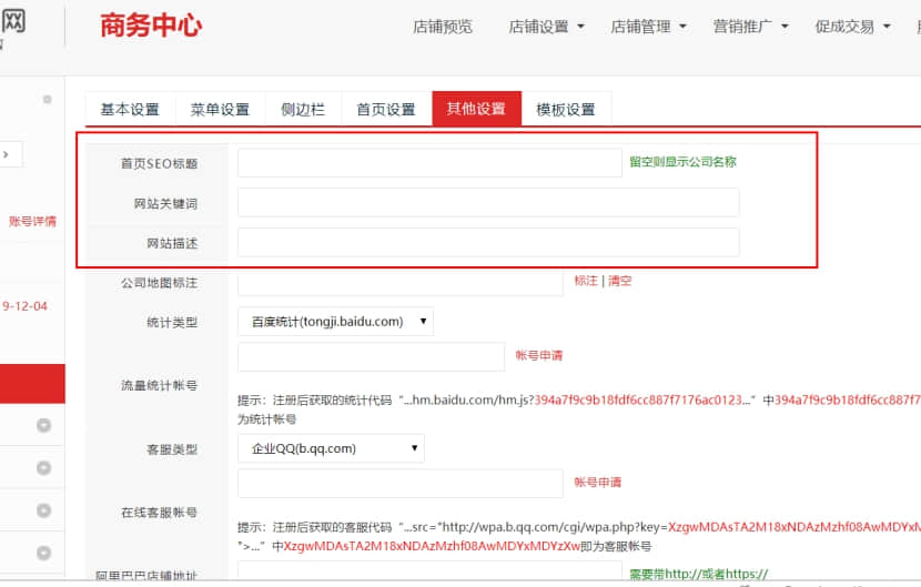 19. 以上操作,基本一個(gè)網(wǎng)站已經(jīng)形出來了.如果你對(duì)網(wǎng)站優(yōu)化感興趣,可以教你幾個(gè)優(yōu)化設(shè)置知識(shí).當(dāng)你升級(jí)成為營(yíng)銷寶會(huì)員后,選擇店鋪設(shè)置,點(diǎn)選其他設(shè)置,即可進(jìn)入網(wǎng)站設(shè)置中心.這里就可以錄入你想的SEOTDK內(nèi)容.還有更多彩蛋,等你去發(fā)現(xiàn).