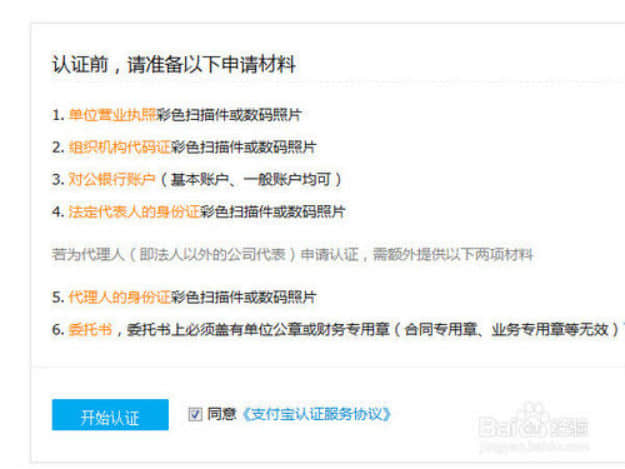 然后會提示你需要準(zhǔn)備什么資料。如圖所示,需要營業(yè)執(zhí)照,組織機構(gòu)代碼,對公銀行賬戶,法人身份證等。如果不是法人開店還需要:代理人身份證,委托書。