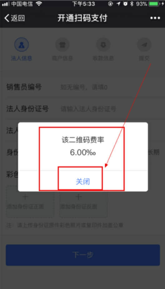 4、點(diǎn)擊進(jìn)入“開通掃碼支付”頁面,此時(shí)系統(tǒng)會(huì)彈框提示“二維碼費(fèi)率為6.00‰(100元0.6元)”,不予理會(huì),直接點(diǎn)擊關(guān)閉即可。