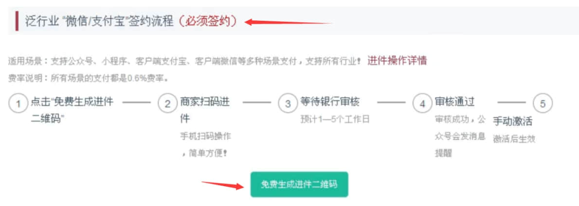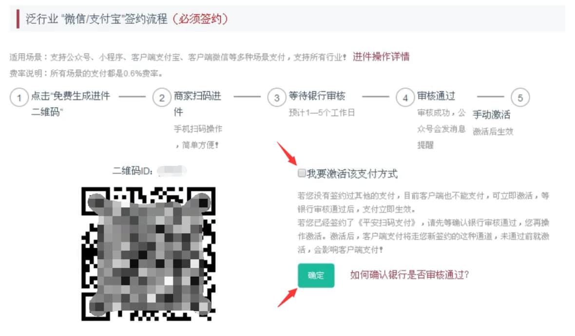 3、微信掃描生成的【進(jìn)件二維碼】,提交商戶資料進(jìn)行申請(qǐng);審核通過后,勾選【我要激活該支付方式】,然后,點(diǎn)擊確定即可!