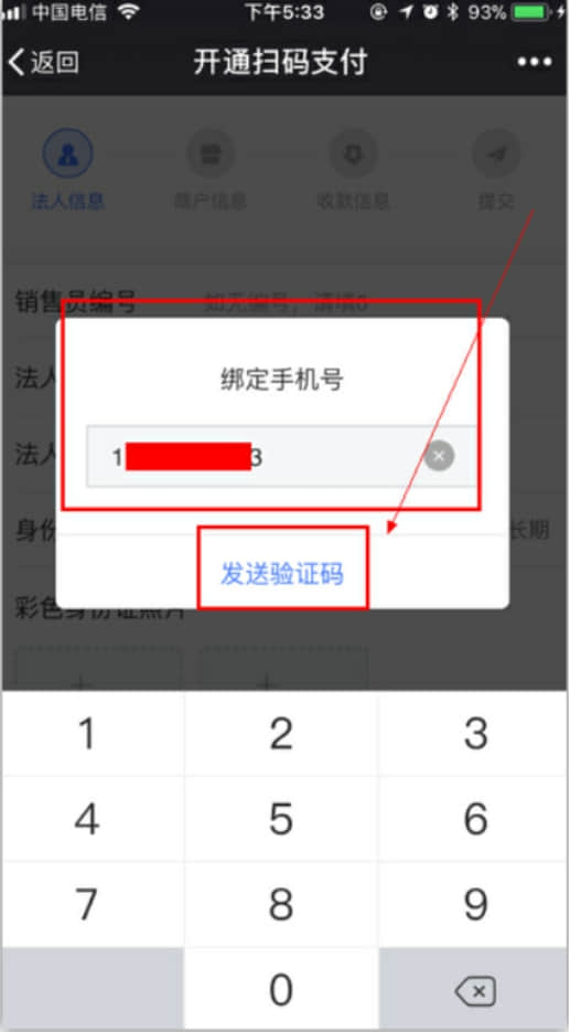 5、輸入手機(jī)號(hào)碼》》》發(fā)送驗(yàn)證碼》》》輸入驗(yàn)證碼;建議填寫商戶老板或者負(fù)責(zé)人的手機(jī)號(hào)。