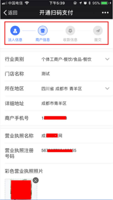 6、根據(jù)要求填寫對(duì)應(yīng)的 法人信息、商戶信息、收款信息,填寫完成后點(diǎn)擊提交。