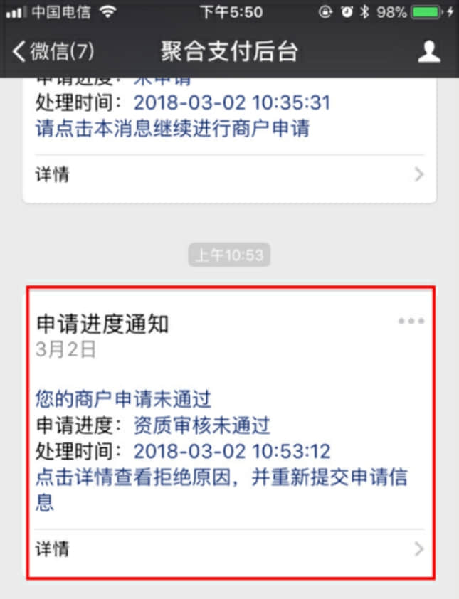若未審核通過,點(diǎn)擊詳情查看未審核通過原因,重新更改提交資料。