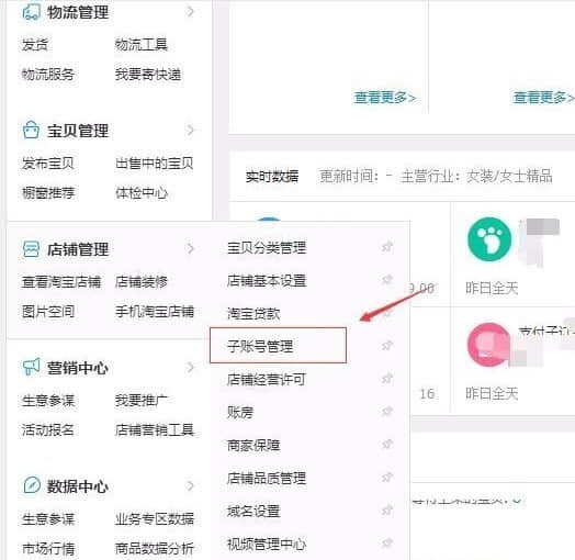 進(jìn)入店鋪后臺(tái),選擇店鋪管理菜單欄;子賬號(hào)管理設(shè)置