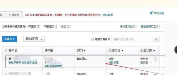 員工信息新建之后,就可在子賬號(hào)中心,員工管理中查詢,需要注意的新建的賬號(hào),需要進(jìn)行認(rèn)證才可用;